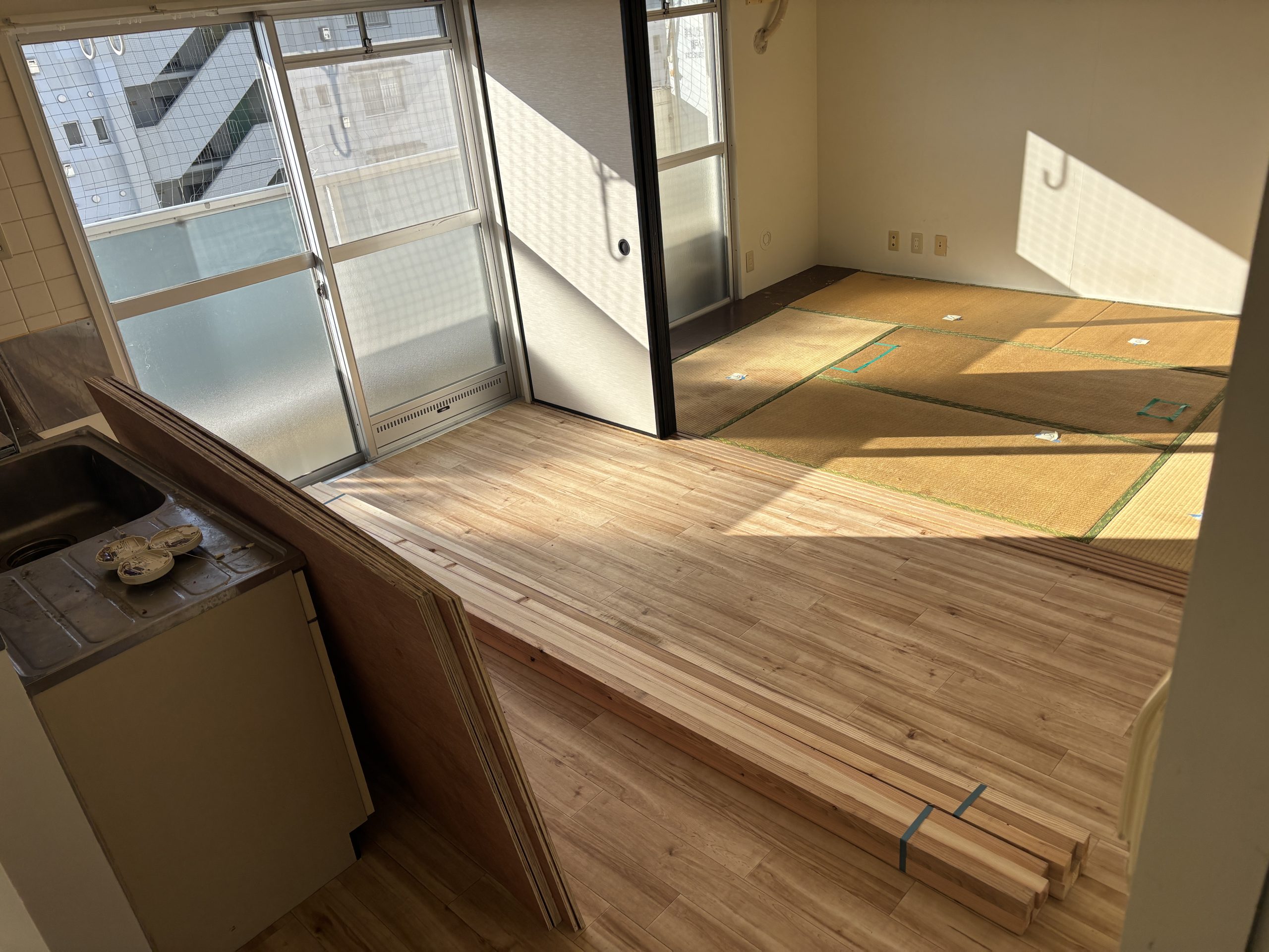 畳を剥がして根太を打ち、合板を張ってクッションフロアにする
